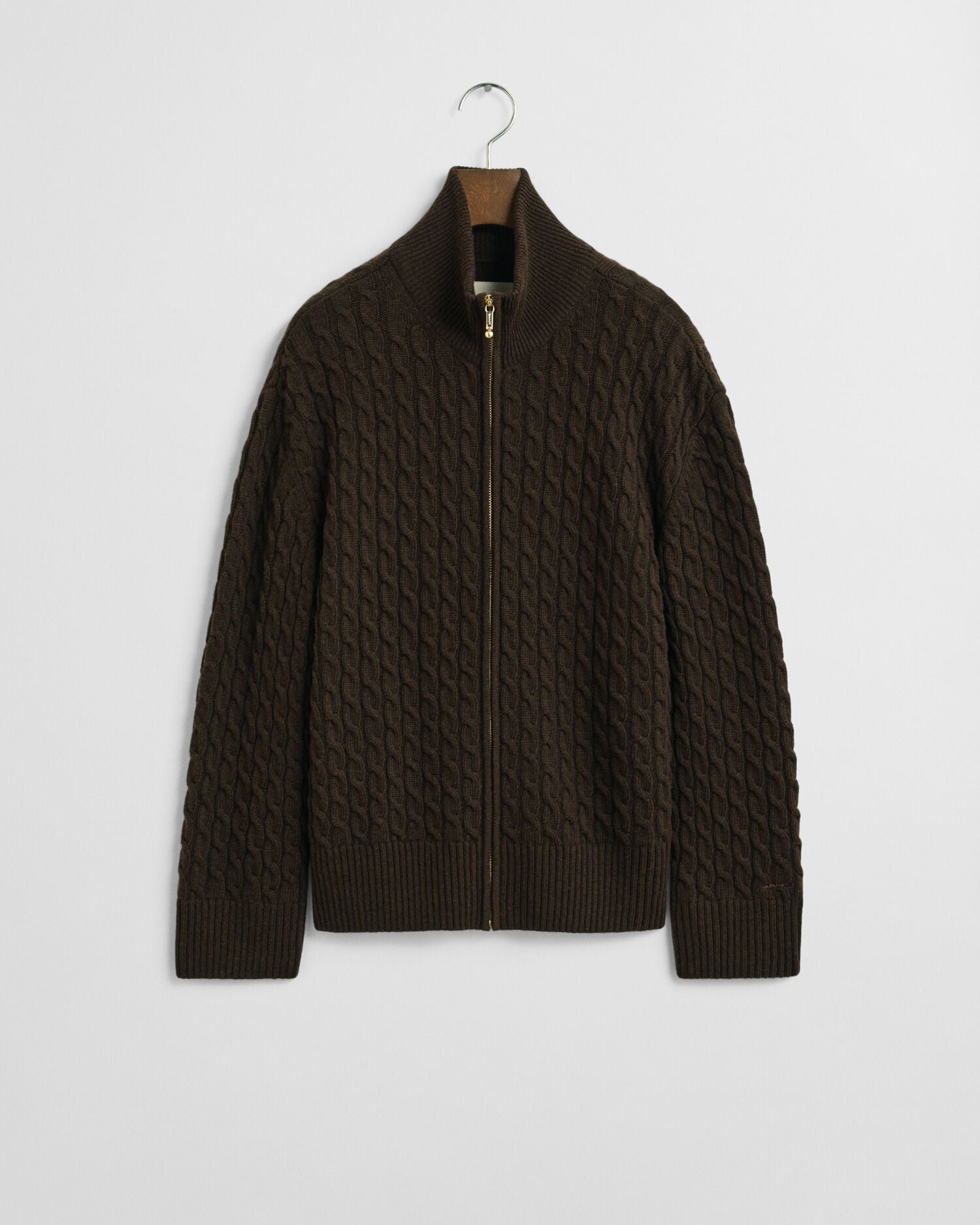 Crafted from a premium blend of Italian wool, viscose and cashmere, this sweater is designed with a relaxed fit and features an all-over cable knit construction. The design has a double ribbed zip-up collar, a two way zipper and stylish ribbing at the sleeve cuffs, neck and hem. This garment is intended for a relaxed fit. For a closer fit, we recommend sizing down.