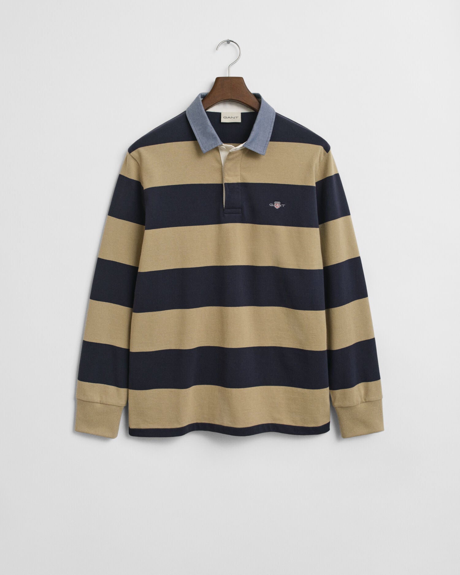Featuring a small-scale shield graphic embroidered at the chest, this striped rugger is crafted from 100% cotton and designed with a regular fit. Timeless, classic and versatile, the design is complete with a chambray collar and a classic three-button placket.