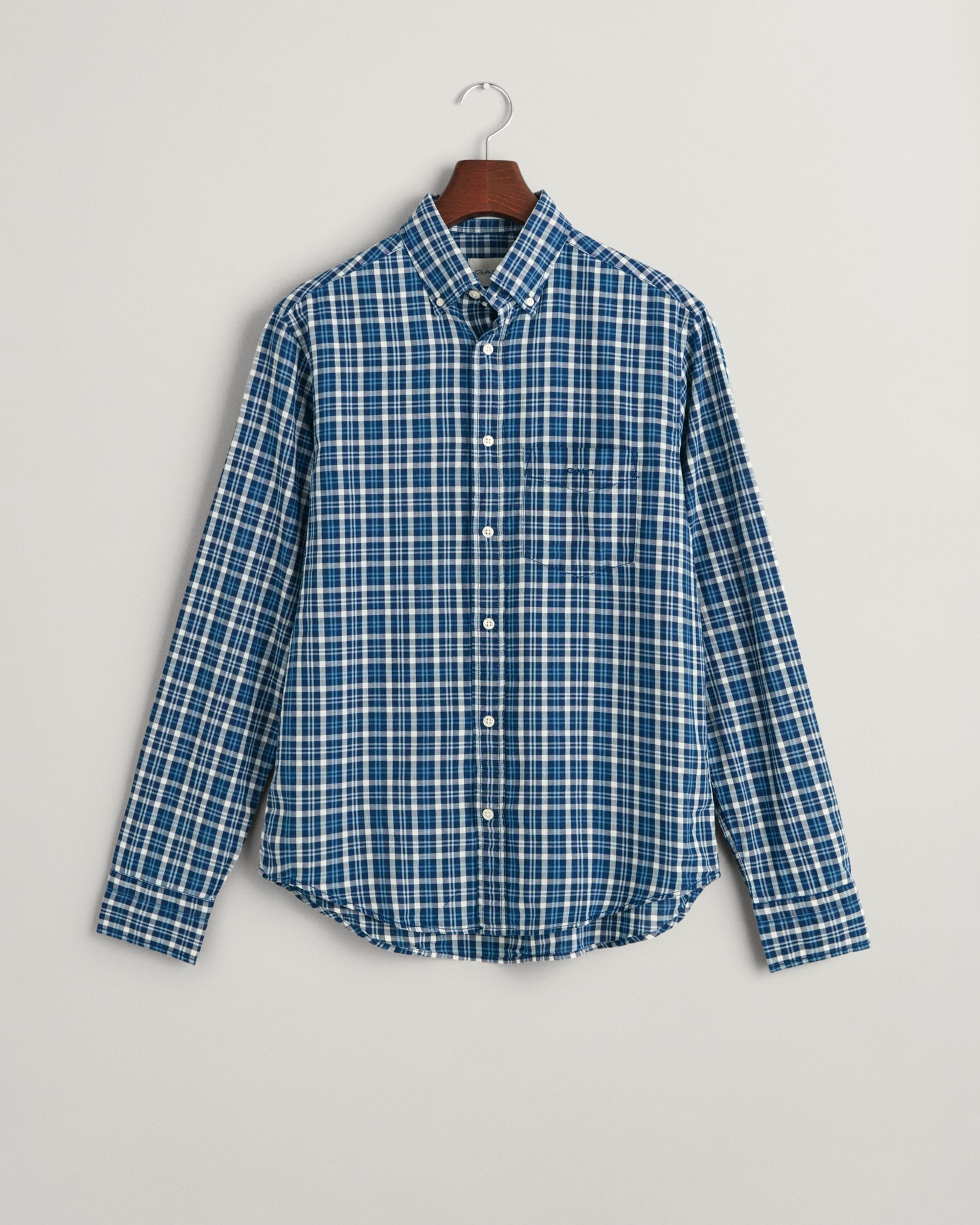 Crafted from 100% cotton, this shirt is cut for a regular fit and adorned with an all-over indigo madras checked pattern. Detailed with a logo embroidered at the chest pocket, the design features a button-down collar, adjustable cuffs, a curved hem and a box pleat with our signature locker loop at the back.