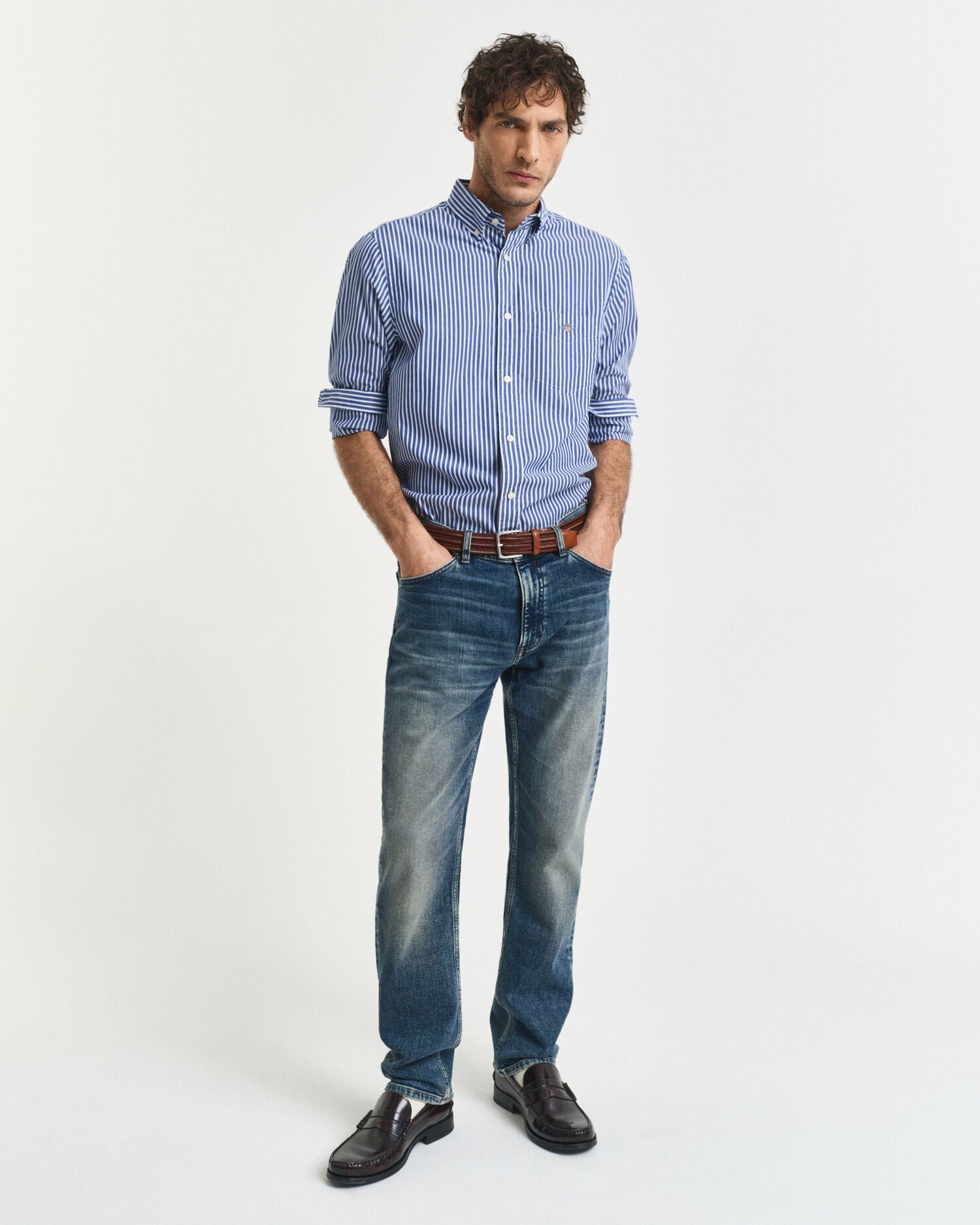Crafted in a durable cotton poplin, this classic shirt is essential to any preppy wardrobe. Designed with yarn-dyed stripes throughout the garment, this shirt is cut for a regular fit and features a button-down collar, curved hem and a box pleat with our signature locker loop at the back. It is accented with an '80s-inspired shield graphic embroidered at the chest pocket.