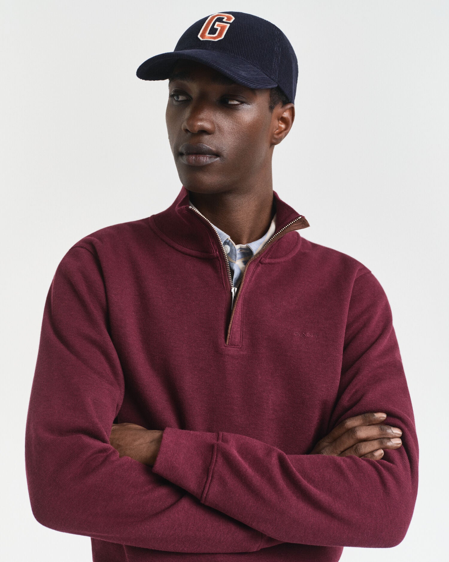 Dressier than a sweatshirt but just as comfortable, this piece is perfect for layering over shirts at the office or over T-shirts on the weekend. Cut from 100% cotton with a soft hand-feel, it is designed for a regular fit with a half-zip collar. Details include imitation suede detailing, a silver metal zip and a tonal logo embroidered at the chest.