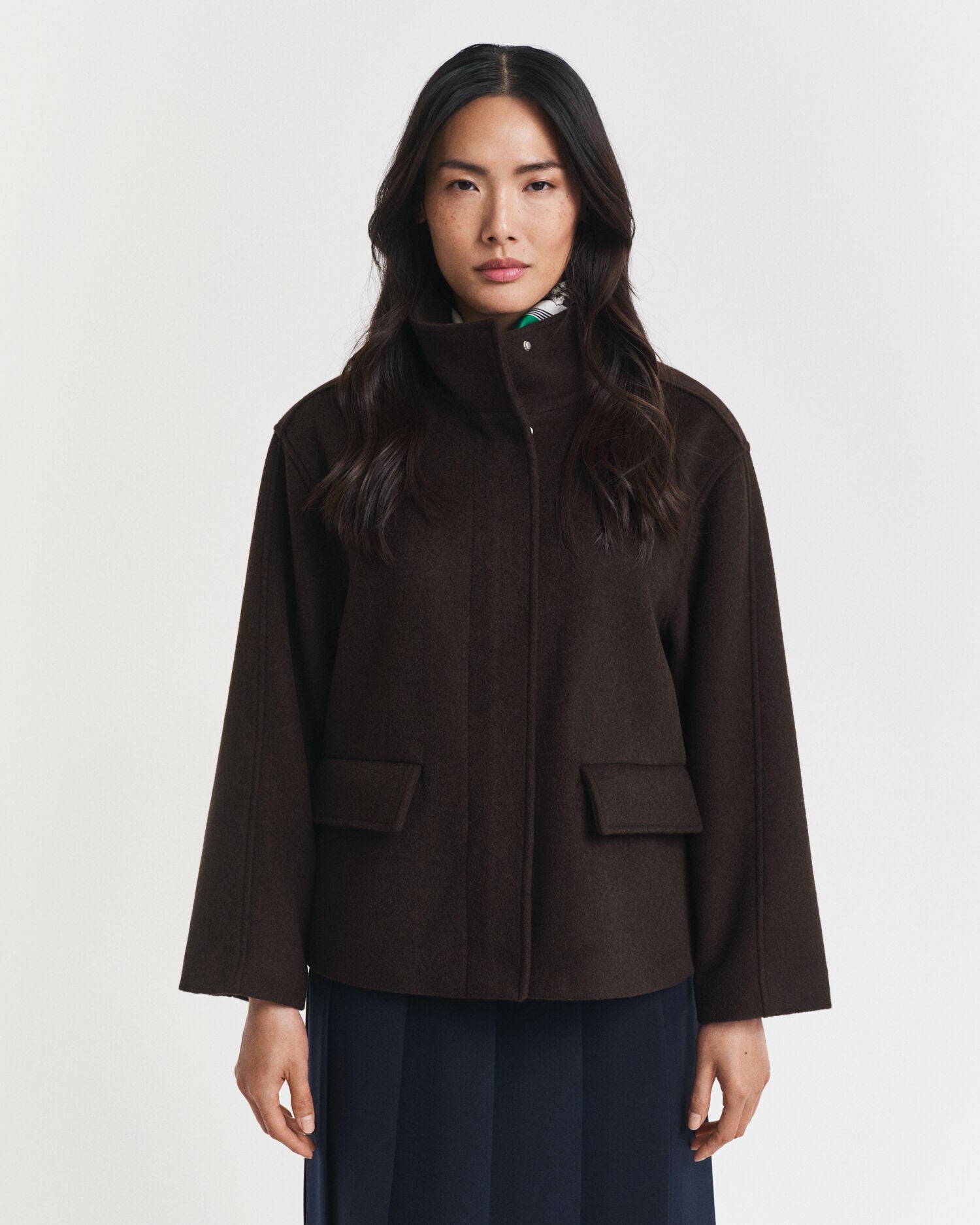 With this jacket in your wardrobe, you'll look forward to days when the temperature dips. It's been made from a wool blend with a luxuriously shiny surface and soft hand-feel. Lined in certified viscose and recycled polyester with a monogram jacquard pattern, this jacket is designed hip length and with dropped shoulders to enhance its relaxed fit. Design features include a stand collar, seam detailing on the sleeves, lower flap pockets and an interior pocket with an invisible zip. This jacket closes with invisible snap buttons at the front and a zip under the placket. This garment is intended for a relaxed fit. For a closer fit, we recommend sizing down.