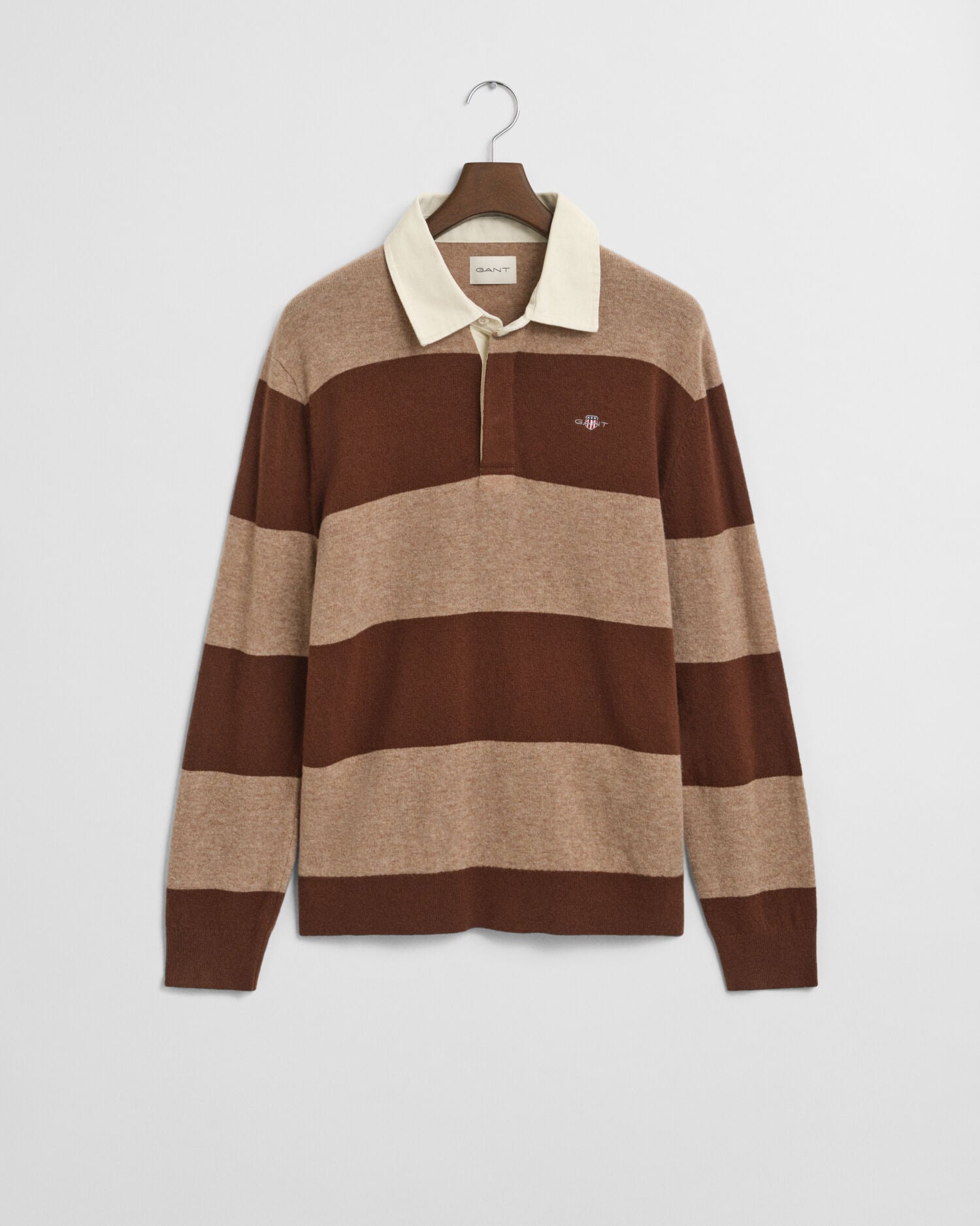 Modeled off a sporty rugger silhouette, this sweater is knitted using a premium wool-blend and features woven cotton twill details. Made for a regular fit and patterned with stripes, it is offset with a buttoned placket in a contrast color. Other design elements include corozo buttons, rib endings and a shield graphic embroidered at the chest.