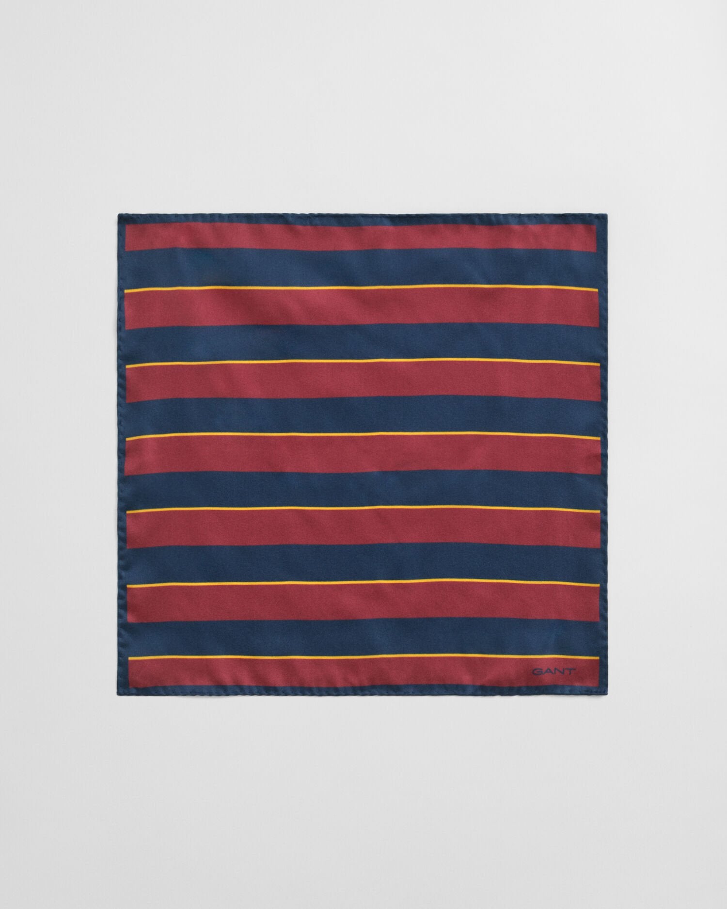 Crafted out of 100% silk, this pocket square has a contrast colored border and a logo printed at the corner. Each colorway features a unique and different striped design.