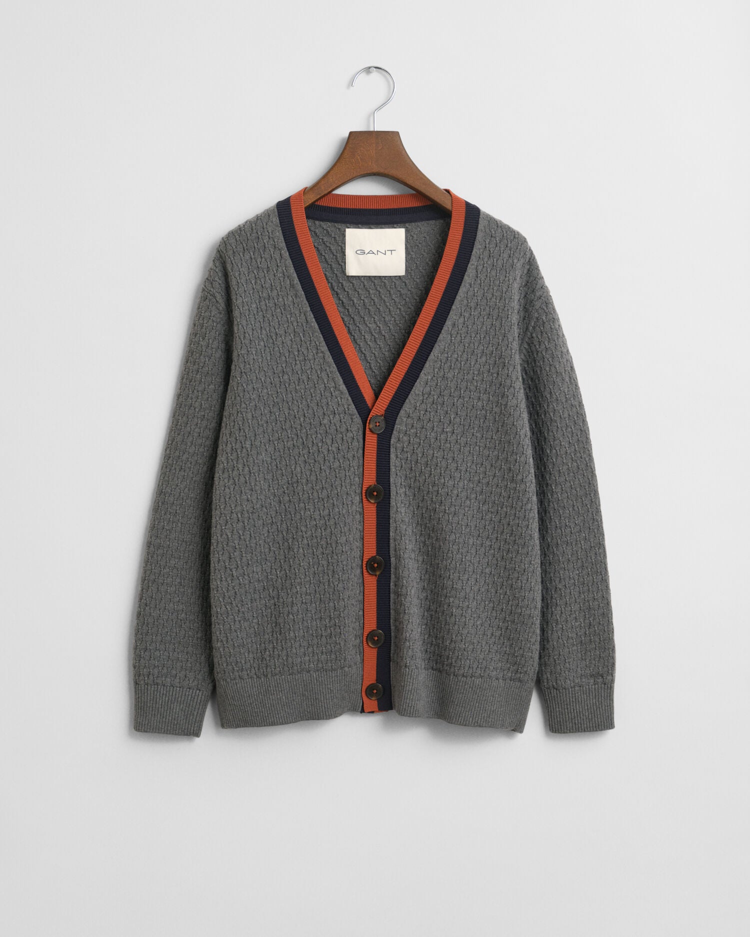 Fashioned from soft organic cotton, this cardigan is designed with a regular fit and v-neckline. Featuring a textured knit structure at the body and sleeves, the design includes a contrast placket, ribbing at the hem and sleeve cuffs and a classic logo embroidered above the sleeve cuff.