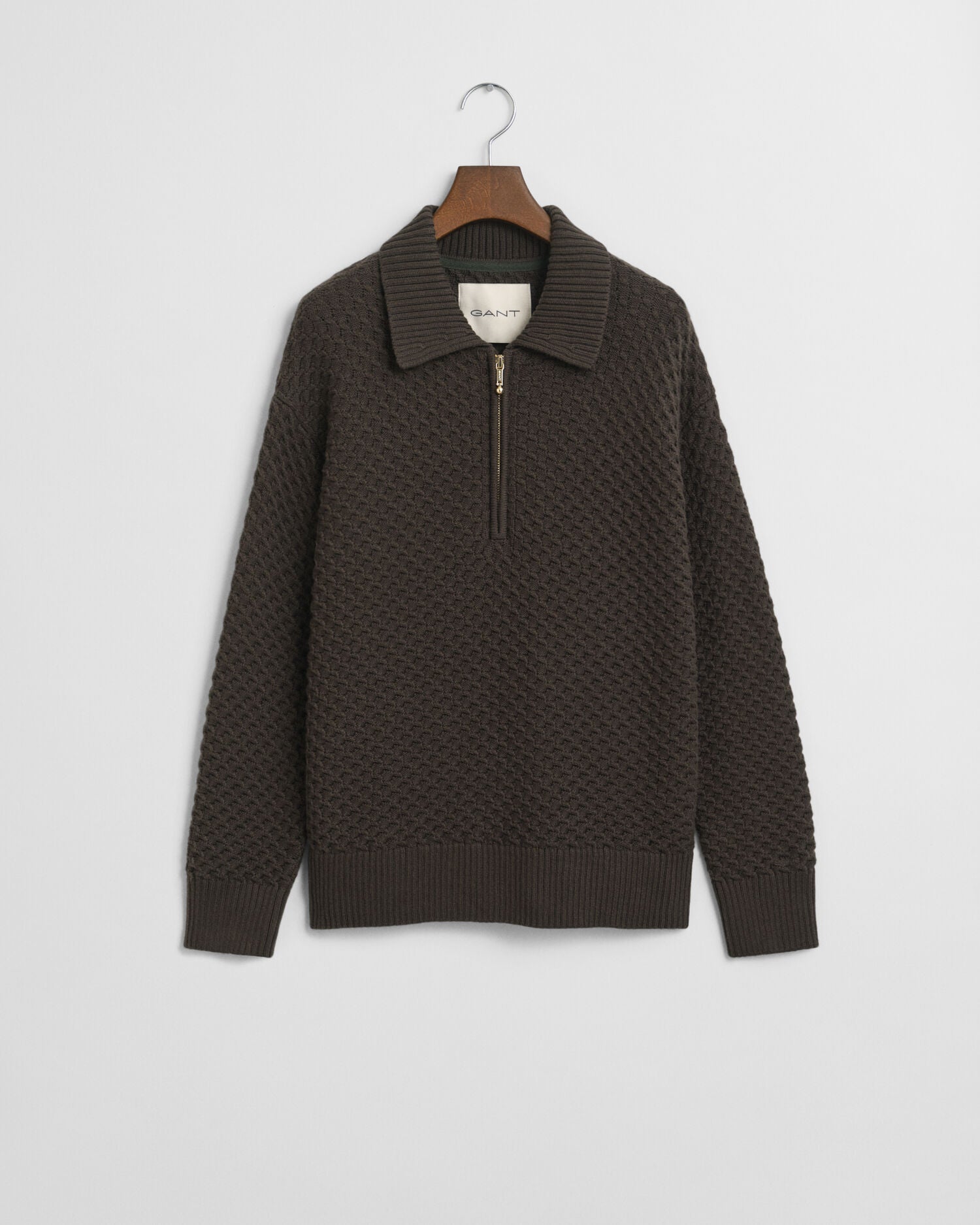 Fashioned out of a soft cotton blend, this half-zip sweater is the perfect piece for transitional weather. Crafted for a relaxed fit, it features a textured knit design, rib endings at the hem and sleeve cuffs and a tonal logo embroidered at the sleeve. This garment is intended for a relaxed fit. For a closer fit, we recommend sizing down.