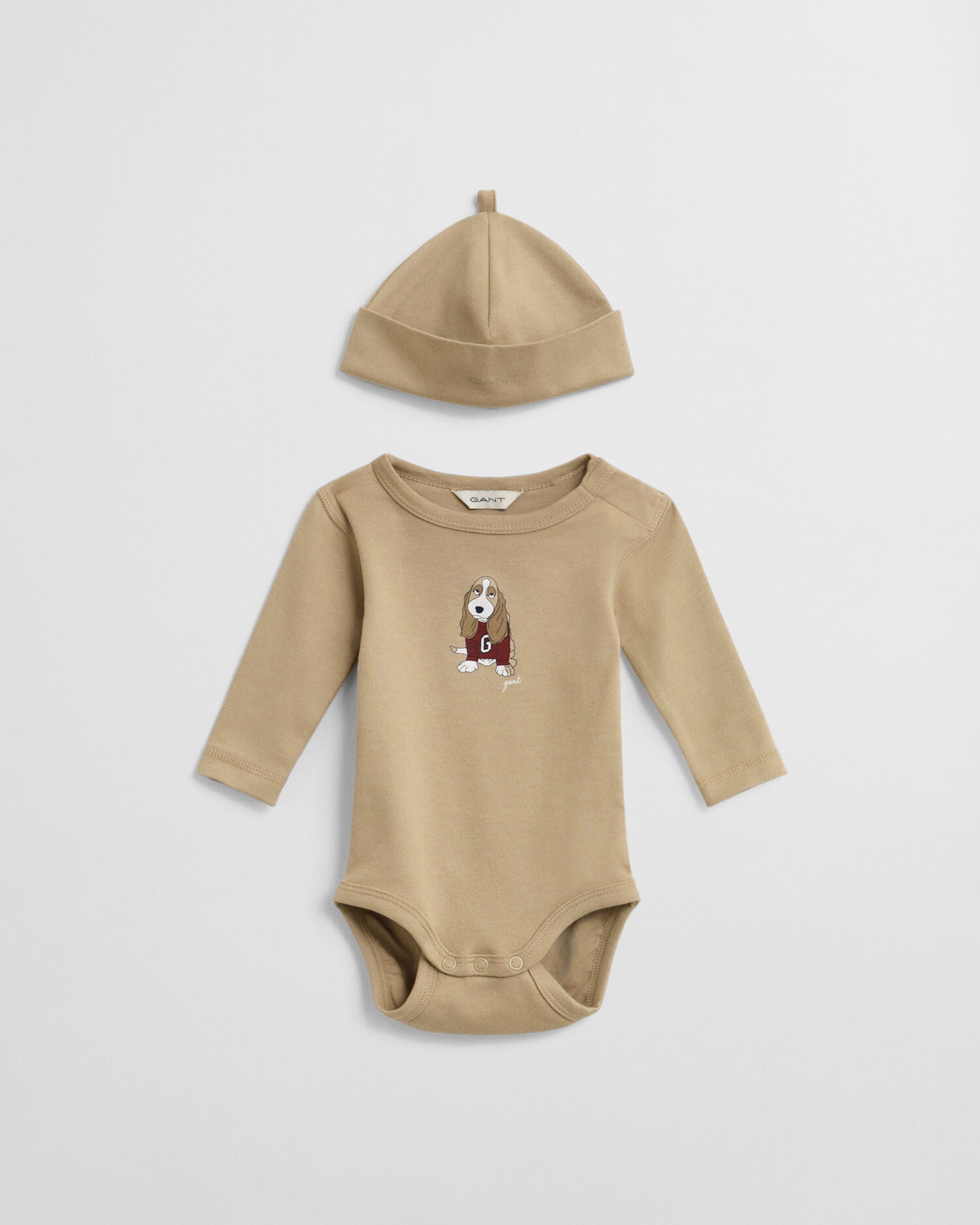 A perfect gift for the little ones, this unisex baby set features a bodysuit and beanie crafted in 100% organic cotton. Super soft, the bodysuit is designed for a regular fit with long sleeves and a crew neck. It is fastened with invisible snap buttons at the shoulder and double snap buttons at the crotch for easy on-and-off dressing. It features a cute, seasonal dog graphic printed at the chest whilst the beanie is detailed with a tonal logo embroidered at the center fold-up.