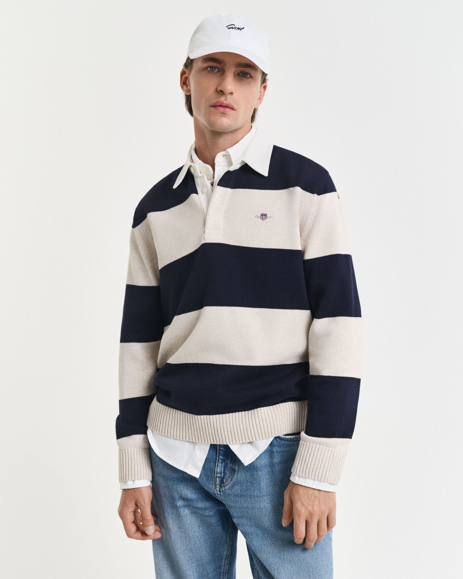 Made from 100% cotton, this sweater is cut for a regular fit and features an all-over plain knit construction. Inspired by our iconic ruggers, this sweater features a woven twill collar and placket adorned with corozo buttons. Patterned with a sporty barstripe design, it is complete with rib endings at the hem and cuffs plus a Archive shield graphic embroidered at the chest.