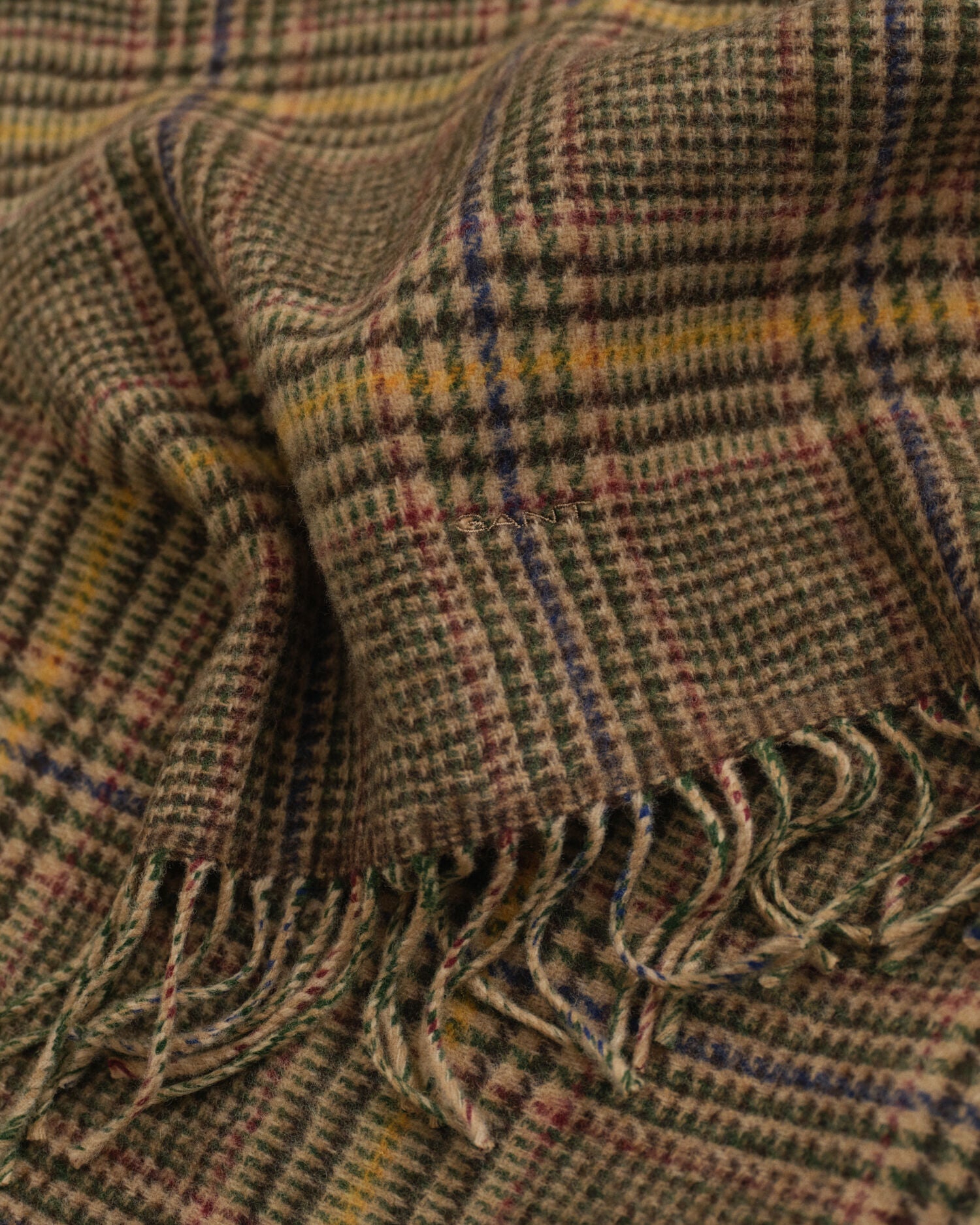 Knitted in 100% wool, this double-faced scarf is patterned with checks on one side and solid on the other. It has subtle fringing on either ends and features tonal embroidery at the center edge.