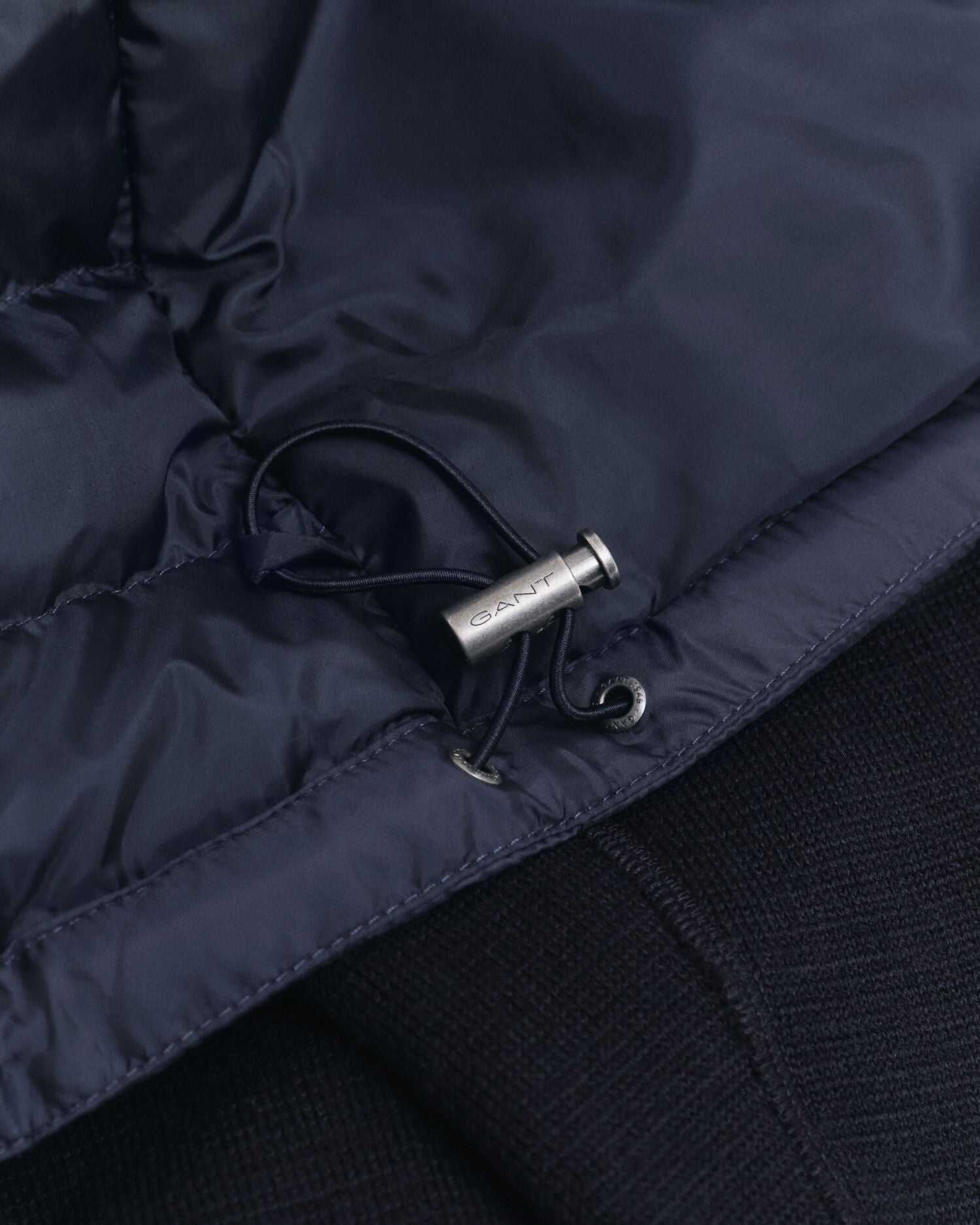 Crafted with a mixed media design, this jacket features channel quilting at the body and knitted wool-blend sleeves for a modern look. Cut for a regular fit, it is constructed with front zip closure, side zip pockets, a drawstring hem and a silicone badge placed at the sleeve. Fully lined, it is designed with a lightly insulated interior and an additional pocket.