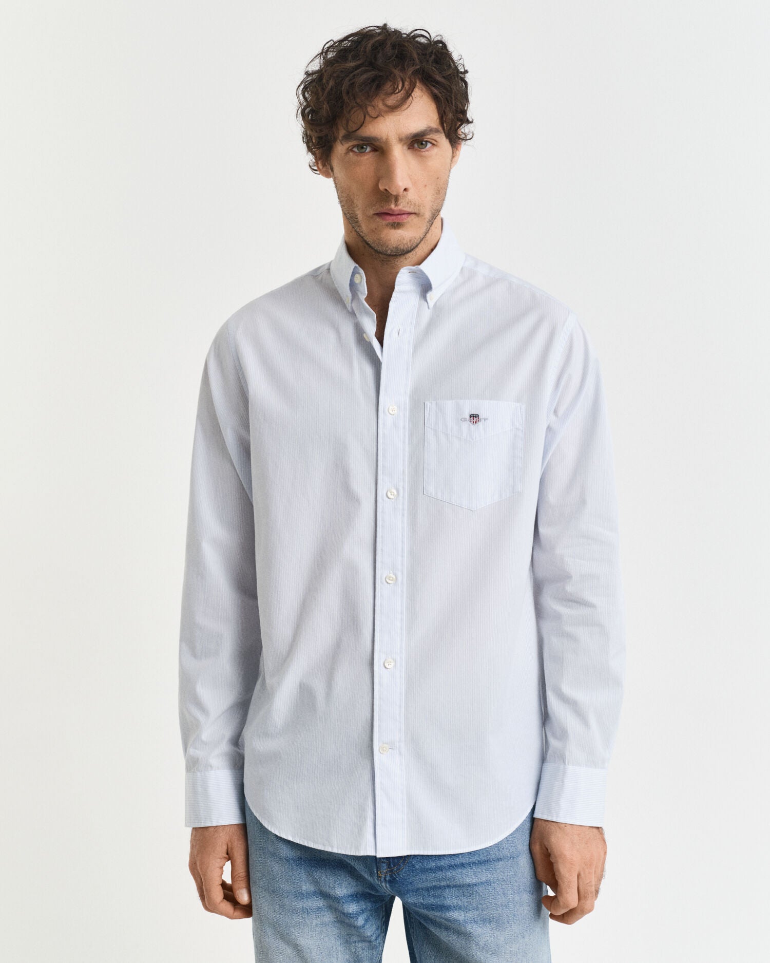 Crafted in a durable cotton poplin, this classic shirt is essential to any preppy wardrobe. Designed with a classic Banker Stripe throughout the garment, this shirt is cut for a regular fit and features a button-down collar, curved hem and a box pleat with our signature locker loop at the back. It is accented with an '80s-inspired shield graphic embroidered at the chest pocket.