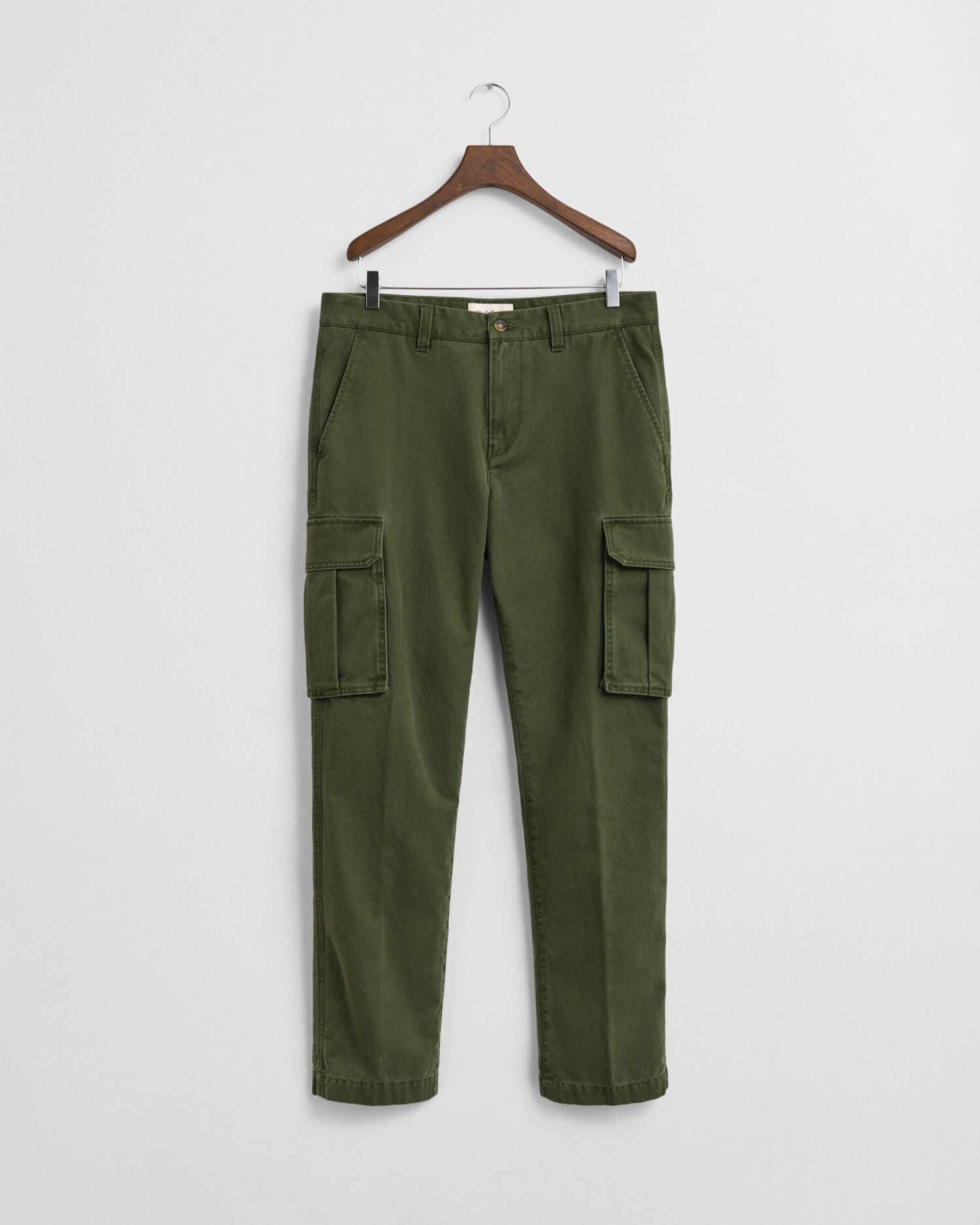 Constructed out of medium-weight brushed cotton twill, these cargo pants are the perfect addition to any wardrobe. Designed for a regular fit, they have a mid-rise waist, straight leg and slight taper below the knee. Details include front button closure, slanted front pockets, box pleat cargo pockets and back flap pockets. To complete the design, the pants also feature imitation horn buttons and an embroidered logo above the right pocket.